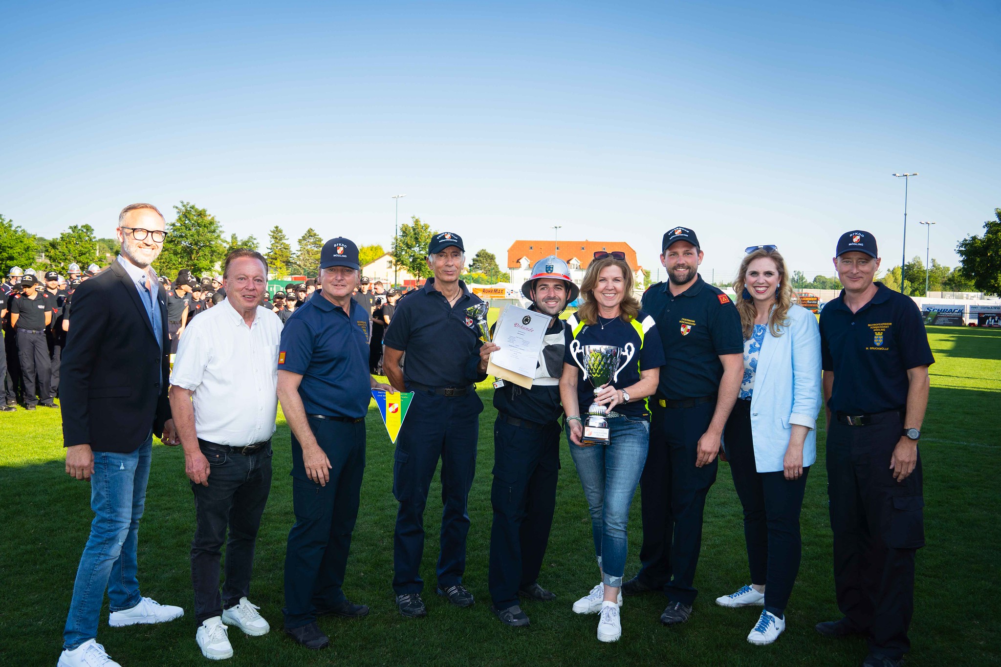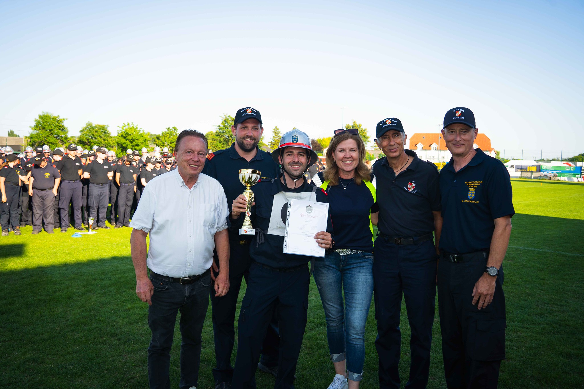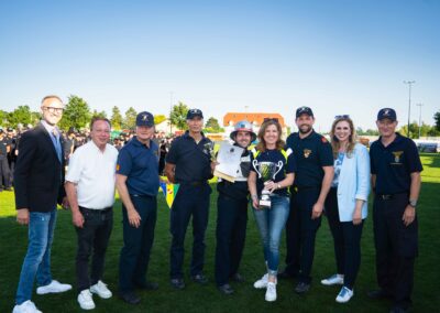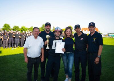Nach der Siegerehrung gab es noch ein Gruppenfoto mit allen Münchendorfer Wettkampfgruppen sowie den zahlreich mitgereisten Fans. Auch Bürgermeisterin Doris Kirstorfer fieberte mit den Wettkämpfern vor Ort mit und war die erste Gratulantin zu den sensationellen Leistungen ihrer Feuerwehr.