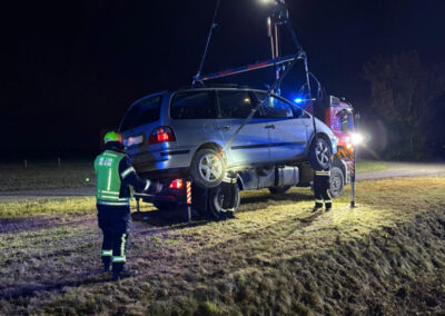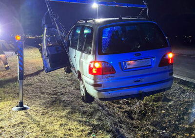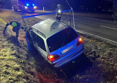 Heute morgen kam es um 5:40 zu einer Alarmierung wegen eines PKW Unfalls auf der Bundesstrasse von Velm kommend. Innerhalb kürzester Zeit fanden sich in den frühen Morgenstunden 7 Kamerad:innen in der Feuerwehr ein um zu helfen. Ein Fahrzeug wurde in der Dunkelheit von einem querenden Reh überrascht. Mit einer schnellen Reaktion konnte der Fahrer den Zusammenprall vermeiden. Auf Grund der seitlich abfallenden Fahrbahn landete er aber danach im Graben. Zum Glück blieben Mensch und Tier unverletzt und wir mussten daher nur das KFZ mittels WLFA-K bergen und den früh aufkommenden Morgenverkehr regeln 🚗🚙🚌🚎🚜