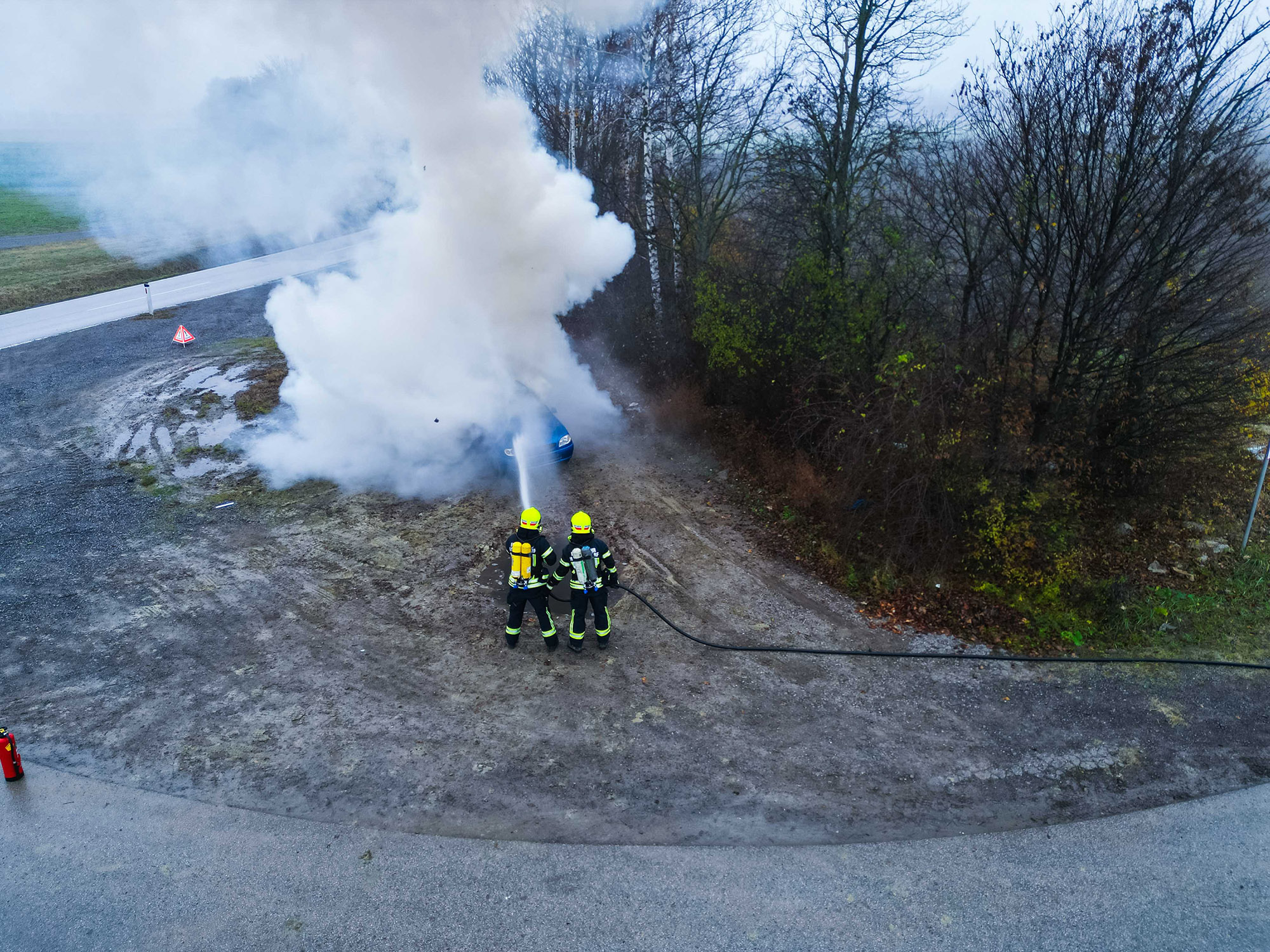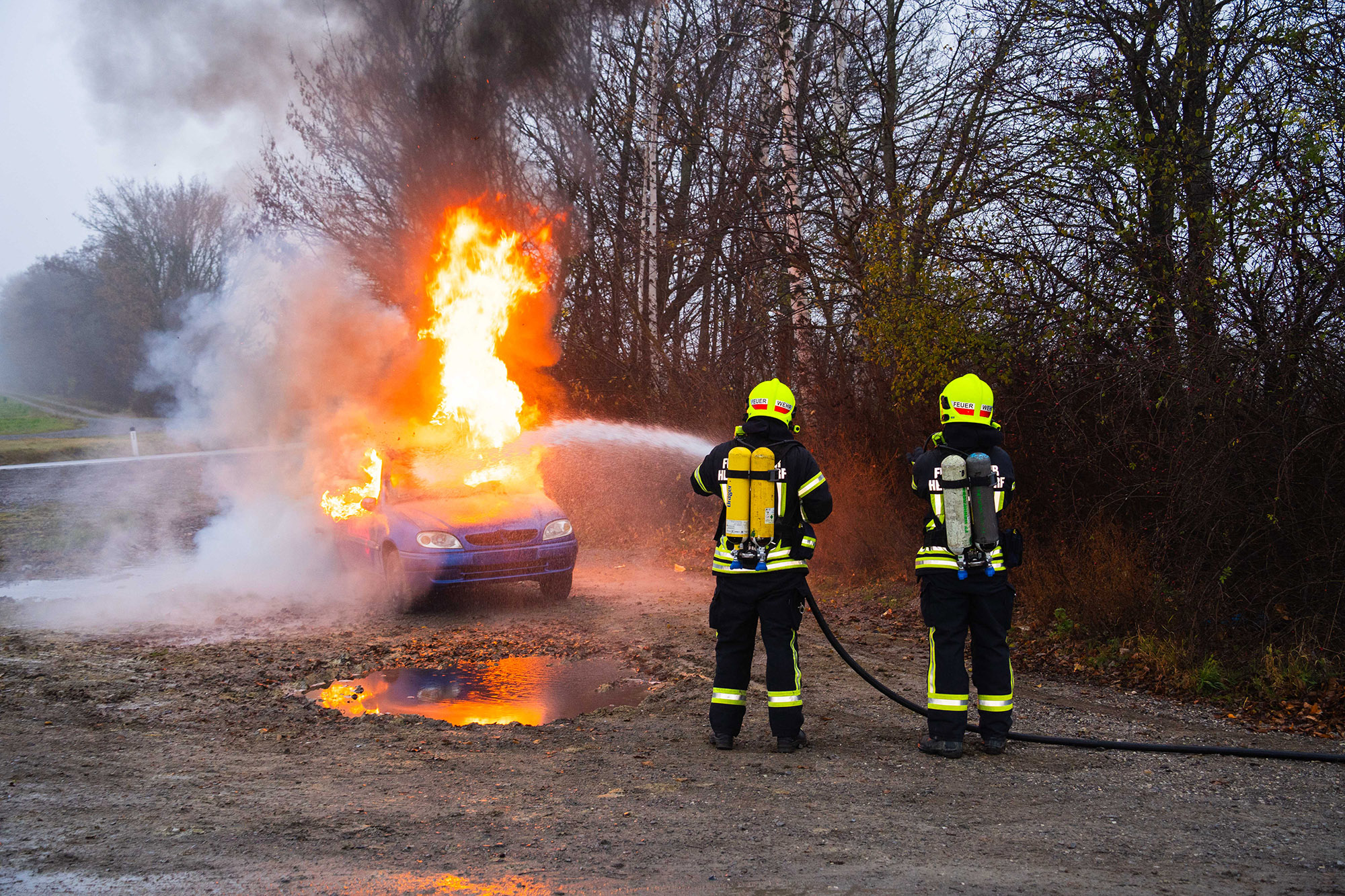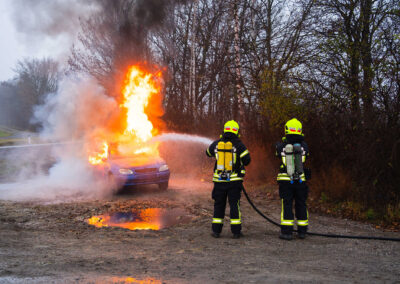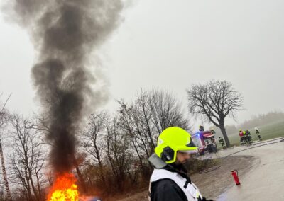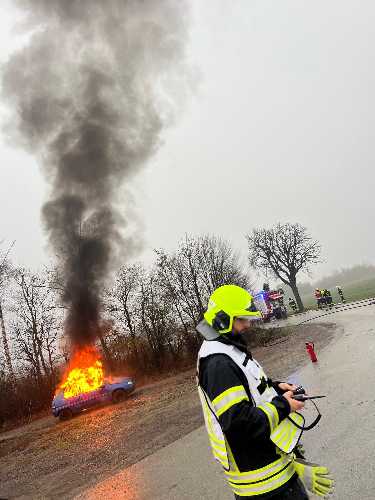 Zu allem Unglück geriet durch einen weiteren “Unfall” dann auch noch ein folgendes Auto in Vollbrand. Schnell mussten sich die Kameradinnen und Kameraden auf die neue Situation einstellen und zum Löscheinsatz ausrücken. 🧯‍‍