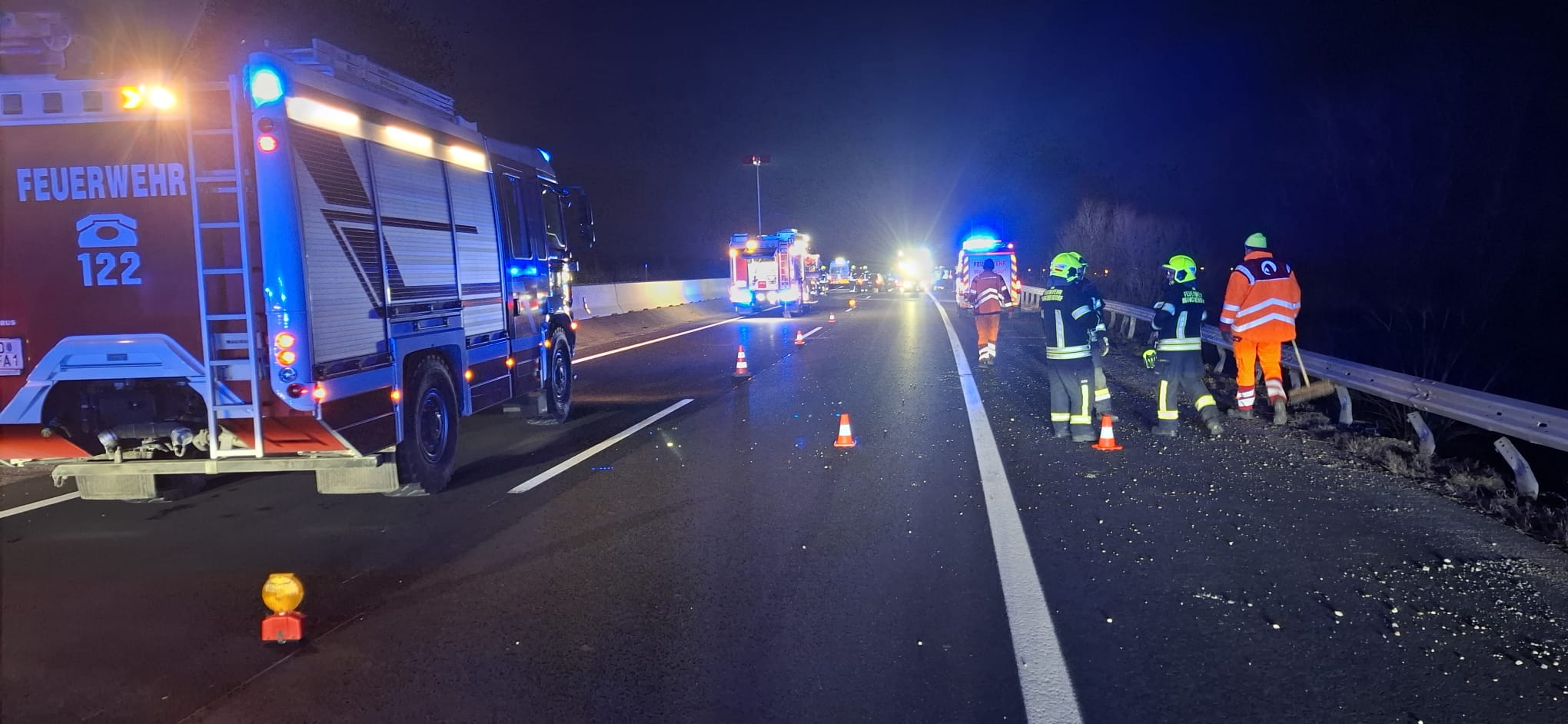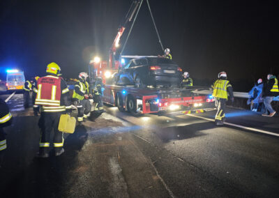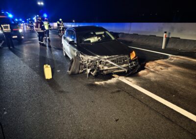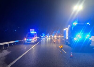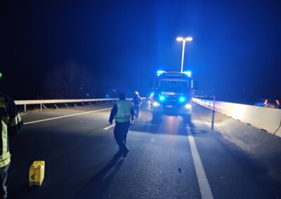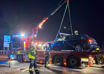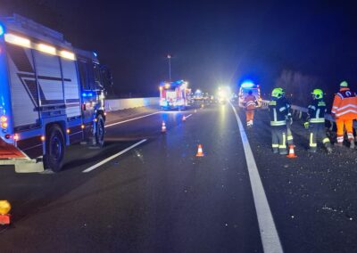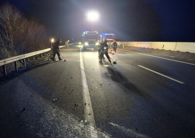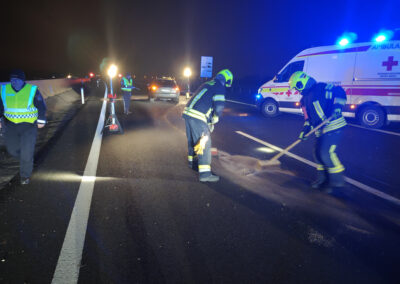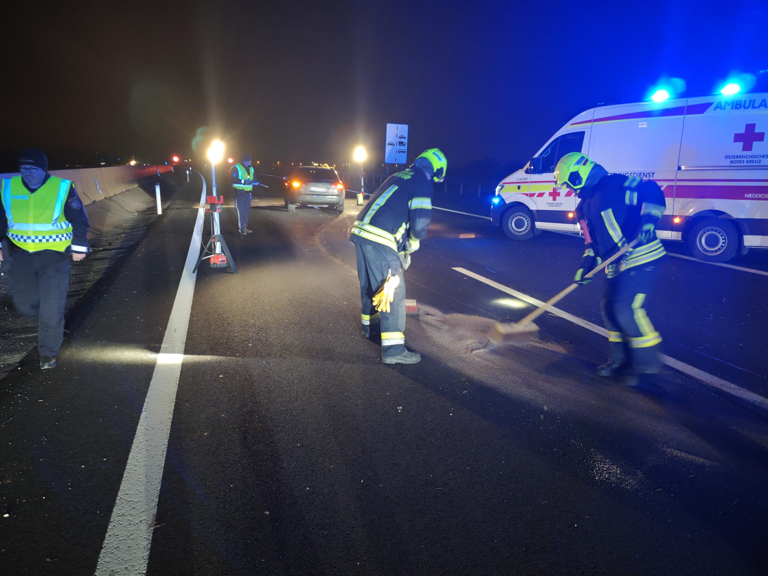 Kurz nach der Alarmierung konnten bereits 12 Kameradinnen und Kameraden ins zwei Einsatzfahrzeugen ausrücken. Da die Feuerwehr Münchendorf als erstes am Unfallort eintraf wurde von uns die Einsatzstelle abgesichert und auf Grund der gefährlichen Situation der Verkehr auf dem Autobahnabschnitt angehalten. Nachdem der Bereich ausgeleuchtet wurde, konnten die Reinigungsarbeiten an der Fahrbahn beginnen um diese wieder für verkehrstauglich zu machen. In der Zwischenzeit wurden auch die Kameraden der Freiwilligen Feuerwehr Wiener Neudorf, um beim Abtransport des nicht mehr fahrtauglichen PKWs zu unterstützen.